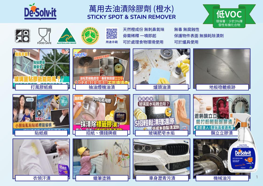 萬用去油漬除膠劑「橙水」採用百分百天然橙萃活性成分,強效迅速對付廚房爐頭油漬、抽油煙機積油、機械重油污,亦可有效去除打風膠紙痕、衣領油垢、招紙膠漬、牆身蠟筆塗鴉等。無腐蝕性,不傷物件表面,天然橙香清新怡人,無刺鼻化學氣味。獲澳洲 HACCP 食品級認證(PE-881-VAR-04),商用廚房食肆安心使用。